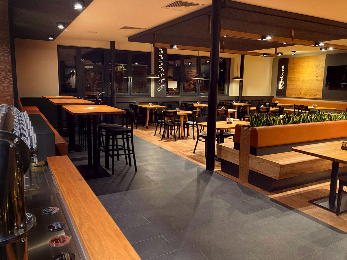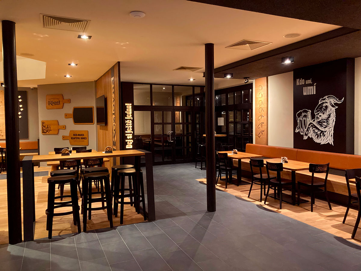 Majestátní socha Kozla, netradiční stoly s kovovými kopýtky nebo další detaily, které Vás osloví. Všechny tyto elementy ve spojení s materiály dřeva, kůže i kovu navozují příjemnou a nezapomenutelnou atmosféru každé Kozlovny.